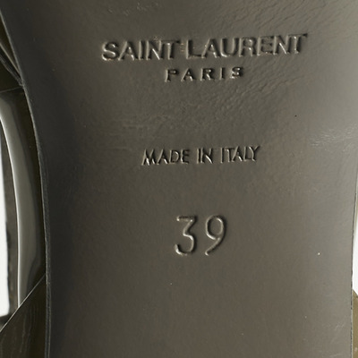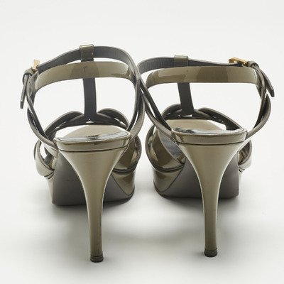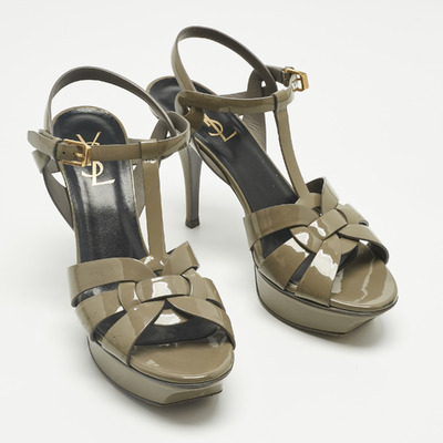 In glossy grey patent leather, these Saint Laurent Tribute sandals combine a towering platform with slender straps and an ankle closure. They balance architectural structure with timeless allure.