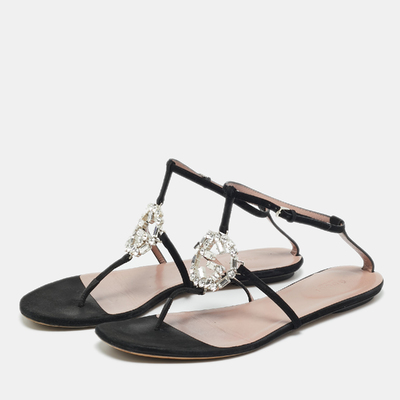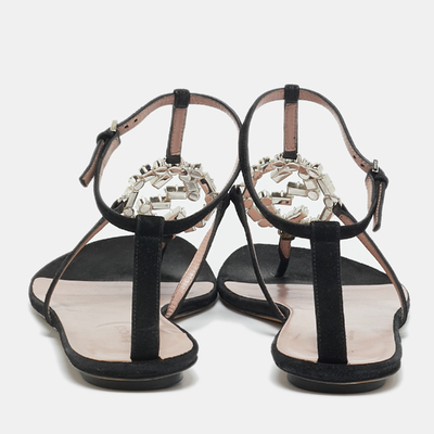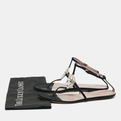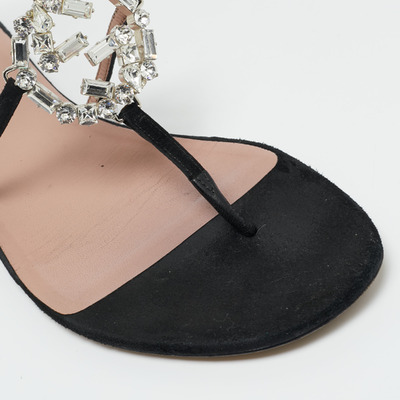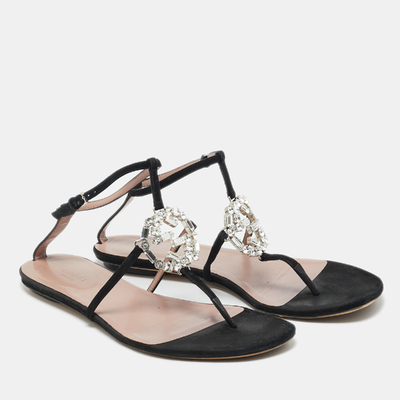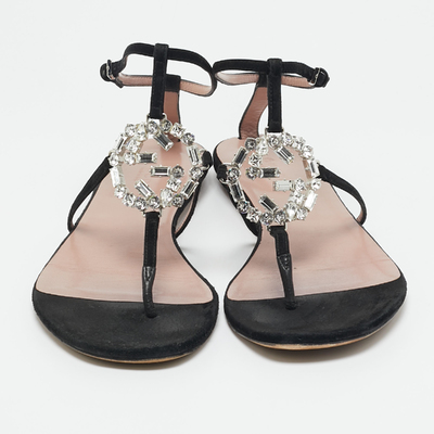 Gucci reimagines casual ease with a touch of shine in these black suede flat sandals. The delicate straps frame crystal embellished GG emblems at the center, turning a simple design into something quietly striking.
