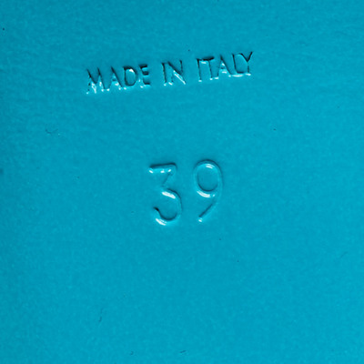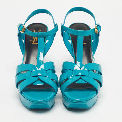 In glossy blue patent leather, Saint Laurent’s Tribute sandals bring bold energy to a classic design. The intertwined straps, slim heel, and platform base create a striking balance of height and glamour.