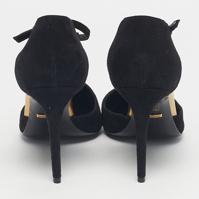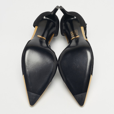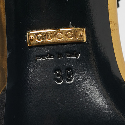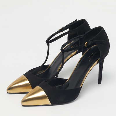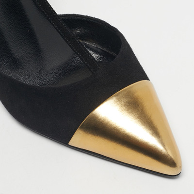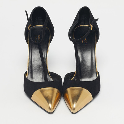 Gucci combines modern glamour with vintage spirit in these Coline T strap pumps. Black suede meets shimmering gold leather for a striking contrast. Perfect for evening occasions, the design nods to the maison’s bold approach to timeless femininity.