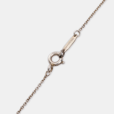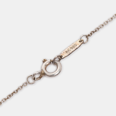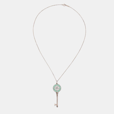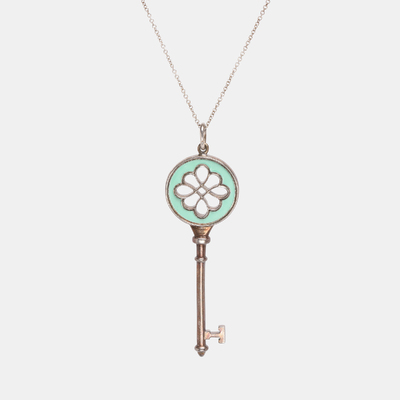 Tiffany and Co. celebrates its tradition of symbolic design with the Knot Key pendant necklace in silver and enamel. Suspended from a refined oval chain, the piece reflects both whimsy and timeless craftsmanship. Keys have long been a Tiffany motif, representing possibilities and treasured moments, making this jewel both sentimental and stylish.