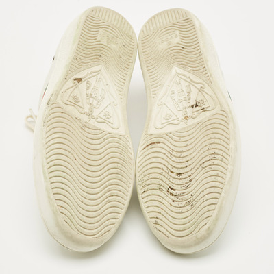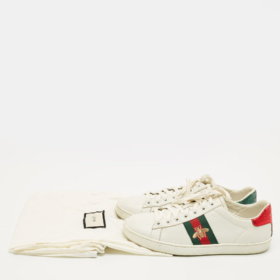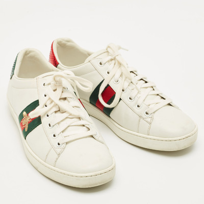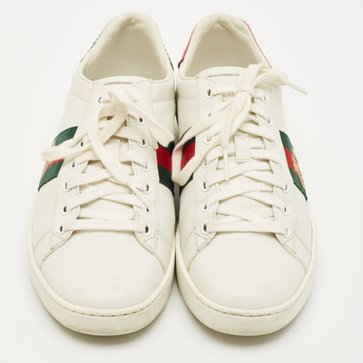 The Ace sneaker in white leather is detailed with a snakeskin embossed counter panel and bee embroidery on the Web stripe. True to Gucci’s signature design, these lace ups balance texture with the clean silhouette of a modern classic.