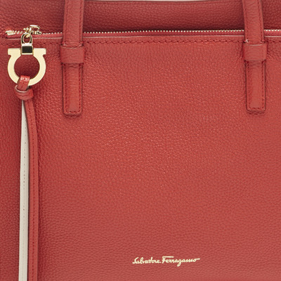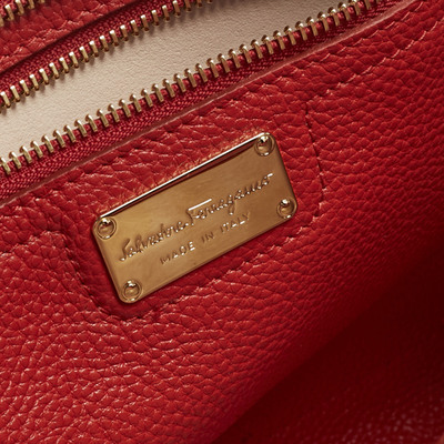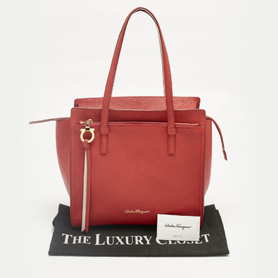 The Salvatore Ferragamo Amy Tote in vibrant red leather adds a polished pop of color to any outfit. With dual zip compartments, a Gancini motif designed zip puller and sleek gold tone hardware, it balances style and functionality effortlessly. Perfect for work or weekend outings.