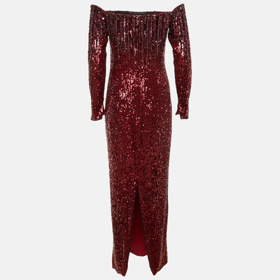 Pamella Roland’s sequinned gown dazzles with its deep red hue and off the shoulder neckline. The fitted cut enhances the figure, while shimmering embellishments bring drama and presence to evening occasions. Perfect for galas or formal events, it reflects the designer’s mastery of glamorous statement dressing. Pair with tonal accessories for a refined finish.