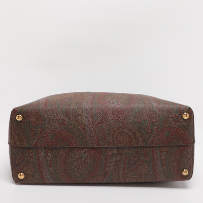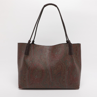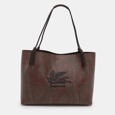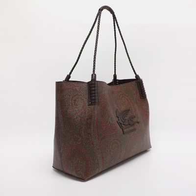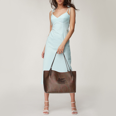 Etro’s Libra tote highlights the house’s signature paisley, reimagined on coated canvas with warm brown undertones. Lightweight yet structured, it balances functionality with artistic design. Generous in size, it’s perfect for workdays, travel, or weekend outings. The tote’s bohemian spirit captures Etro’s heritage while providing everyday ease, making it a refined carryall for those who appreciate iconic patterns with practical charm.