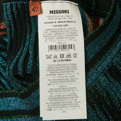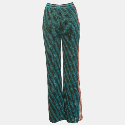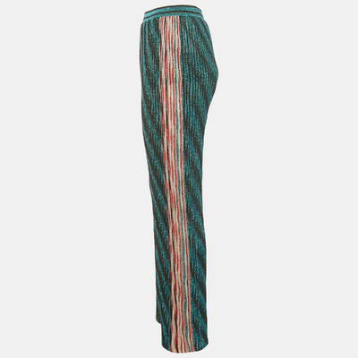 Missoni’s striped trousers shimmer with lurex threads, bringing the label’s signature knitwear artistry to a fluid wide leg silhouette. Multicolor striping creates rhythm and movement, making this piece a standout choice for both casual and polished edits. Style with a plain blouse or the matching knit for a coordinated look.