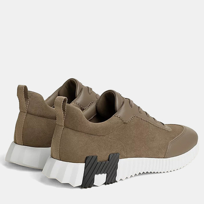 In size 44, the Hermès Bouncing sneaker comes in soft etoupe suede and leather, offering a natural tone and breathable wear. Built with a cushioned sole for lasting support.