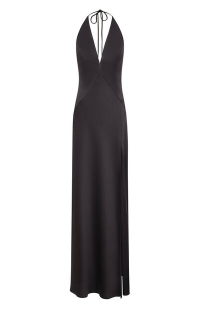 Макси-платье Rene с американской проймой и открытой спиной выполнили из полиэстерового атласа. Модель с бретелями, завязывающимися на шее сзади, дополнили высоким разрезом сбоку.