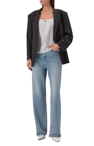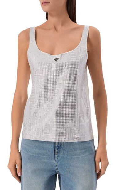 Майку из хлопкового джерси покрыли миниатюрными стразами. Под широкой круглой горловиной разместили фирменную треугольную пластину.