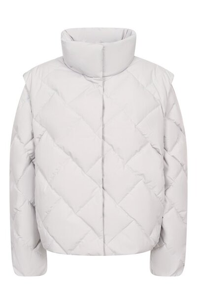 Стеганый пуховик из нейлона дополнили высоким воротом и боковыми карманами. Если отстегнуть рукава, куртка на гусином пуху превратится в жилет. Модель застегивается молнией и кнопками.