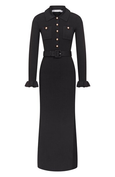 Приталенное макси-платье с высоким боковым разрезом и волнистыми манжетами выполнили из вискозного трикотажа в рубчик. Модель с двумя нагрудными карманами и поясом с пряжкой застегивается золотистыми пуговицами.