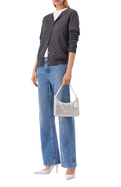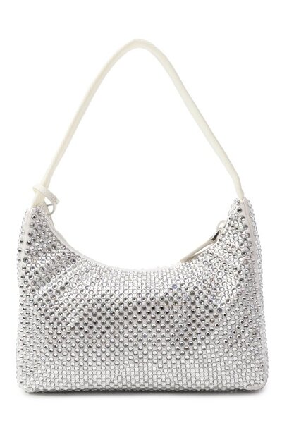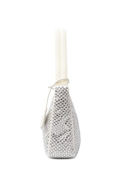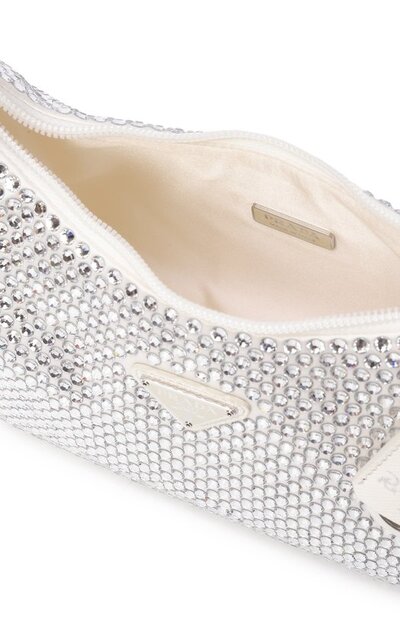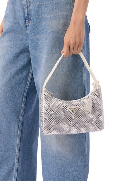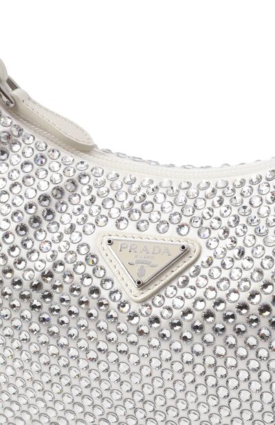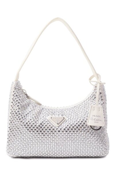 Для создания сумки Re-Edition 2000 с короткой ручкой и съемным брендированным брелоком для ключей использовали атлас. Аксессуар, полностью покрытый стразами, украсили фирменным эмалевым треугольником.