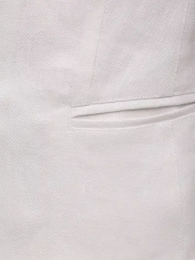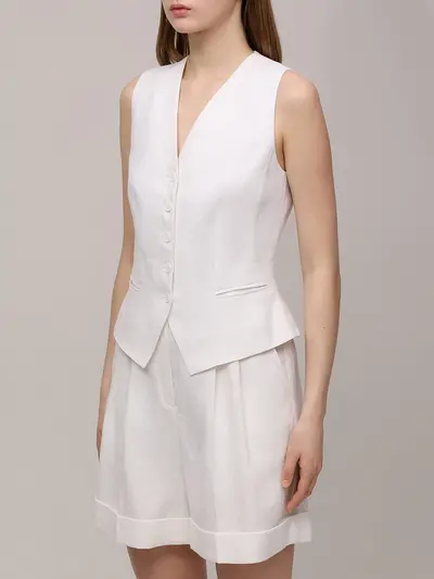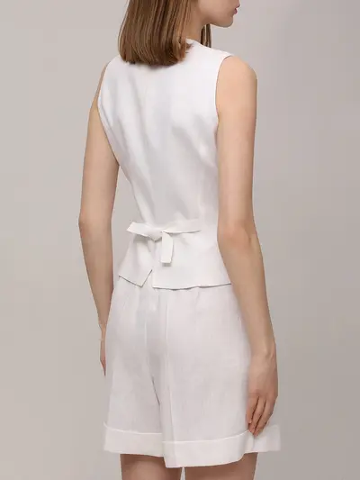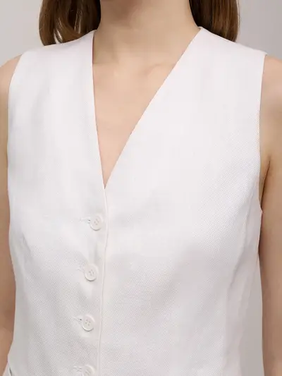 -Белый жилет из легкого дышащего льна от SHATU. -Однобортная модель приталенного кроя с прорезными карманами, V-образным вырезом на груди, застежкой на пуговицы. -Ремешки на спинке позволяют регулировать посадку по фигуре.