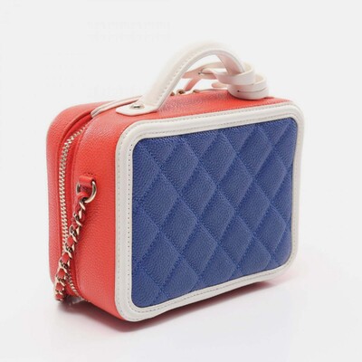 Compact and structured, this Chanel Filigree vanity bag is made from durable grained calfskin in a bold mix of blue, red, and white. The double C logo and top handle design offer a playful yet functional twist.