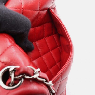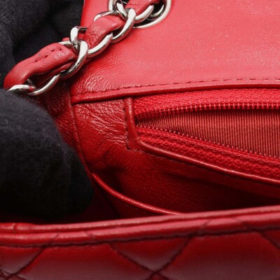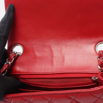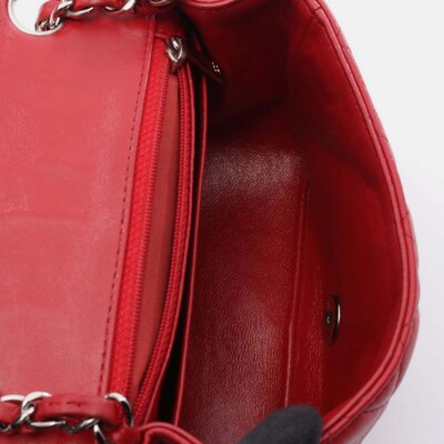 A compact Chanel mini bag in bright red leather with traditional matelassé quilting and a long chain strap. Perfect for carrying the essentials.