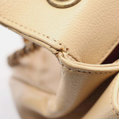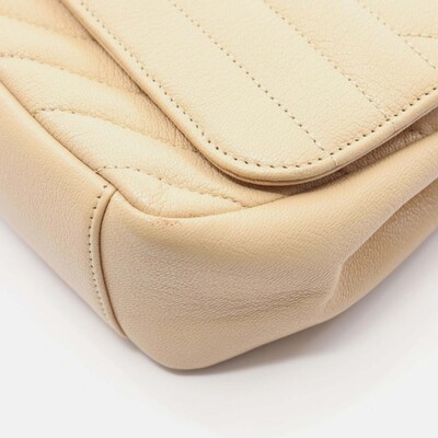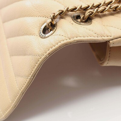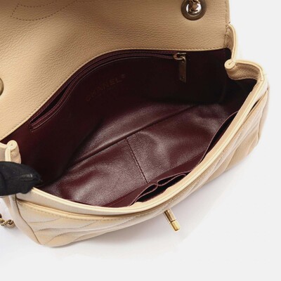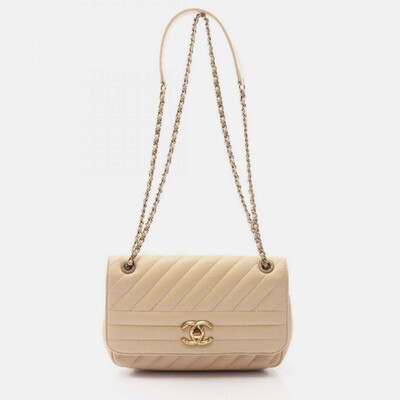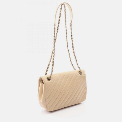 This Chanel flap bag features a unique diagonal quilted pattern in soft beige goatskin leather. Designed with a classic chain strap and subtle metal hardware, it adds a neutral tone to everyday looks.