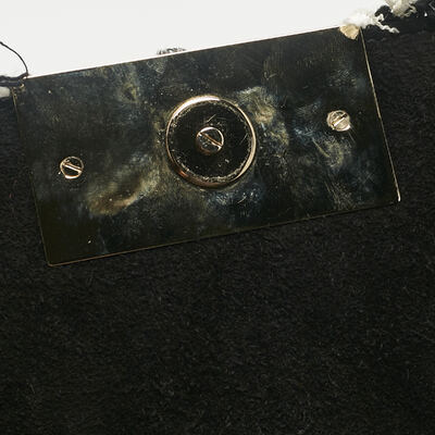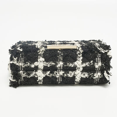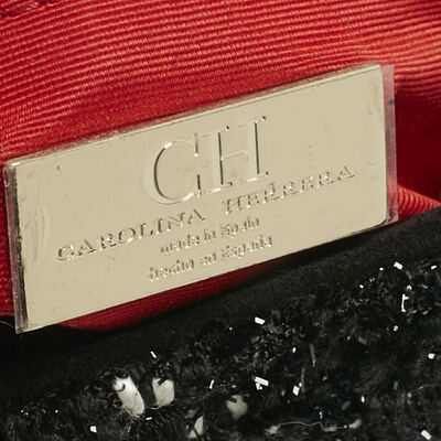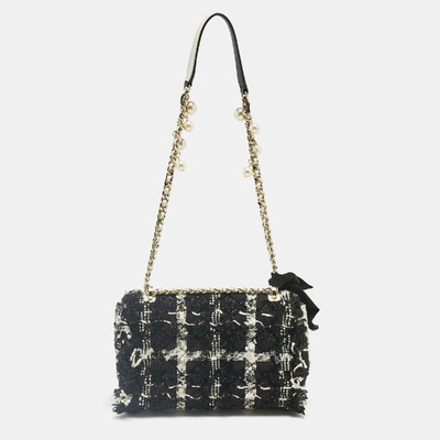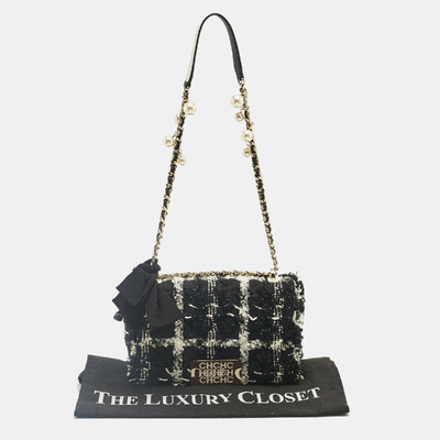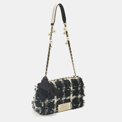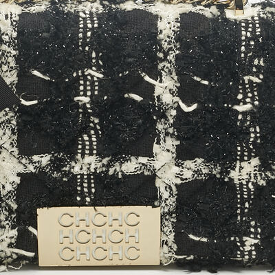 Carolina Herrera gives tweed a playful twist with this black and white shoulder bag, adorned with a cascade of pearls along the chain straps. The gold tone CHHC plaque gives it a signature flair, while the compact interior makes it a luxurious companion for evenings out or chic daytime gatherings.