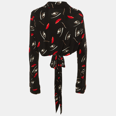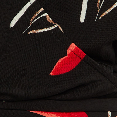 Diane von Furstenberg’s wrap around Bobbie top comes alive with its playful face and lip print scattered over soft black jersey. The tie front design and fluid drape capture the brand’s signature ease, making it a piece that moves with personality.