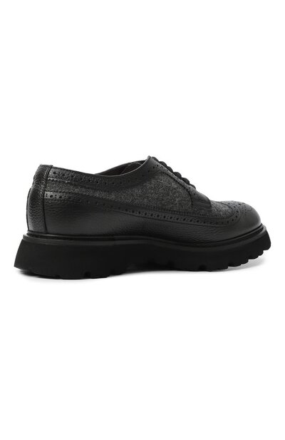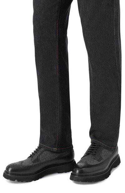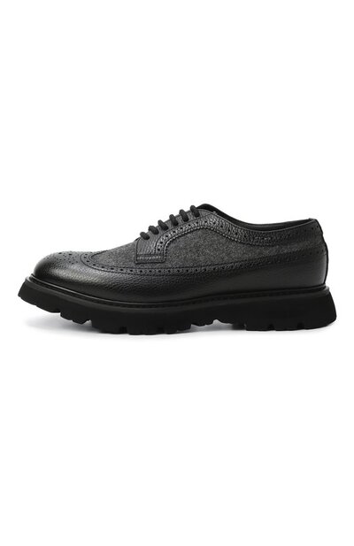 Для изготовления дерби с брогированным узором использовали зернистую кожу и фактурный текстиль. Модель поставили на широкую подошву с глубоким протектором.