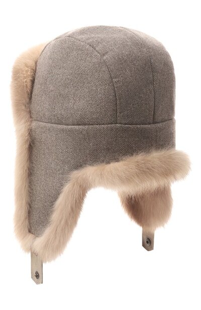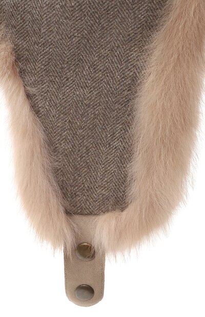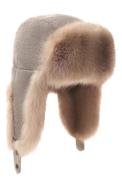 Создавая темно-бежевую шапку-ушанку, дизайнеры марки сыграли на контрасте фактур. Для пошива аксессуара использовали легкий кашемир с шевронным узором, для внутренней отделки — шелковистый мех соболя естественного окраса. Драгоценный материал с густой подпушью, которую оттеняет характерная серебристая ость, особенно хорошо сохраняет тепло.