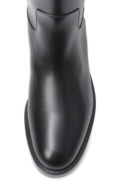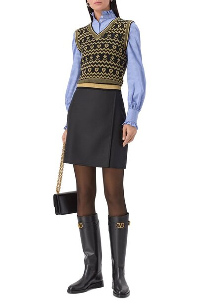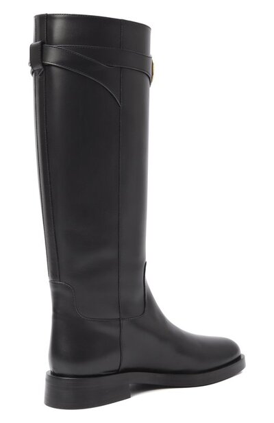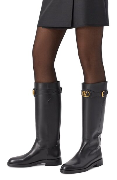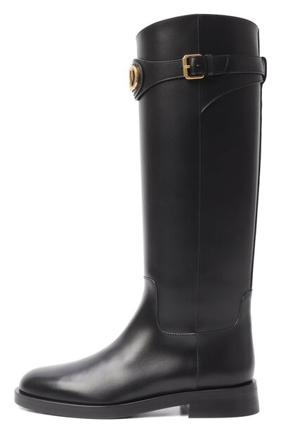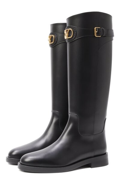 Сапоги VLogo Signature на невысоком устойчивом каблуке выполнили из телячьей кожи. Прямое голенище без застежки декорировали ремешком с золотистой фирменной эмблемой и боковой пряжкой.