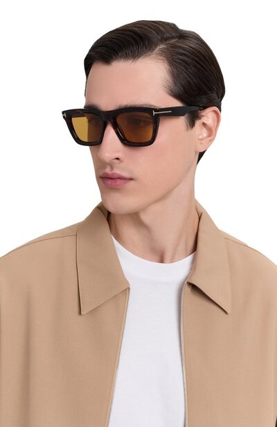 Квадратные солнцезащитные очки Lelio из ацетата с черепаховым мотивом дополнили линзами, полностью блокирующими ультрафиолет. Аксессуар украсили литерами T и фирменными вставками на заушниках.