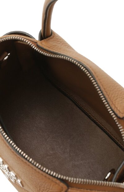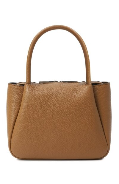 Сумку Flou на встречной молнии выполнили из зернистой телячьей кожи, выбрав для внутренней отделки наппу. Переднюю панель декорировали прошитым фирменным треугольником с металлическим логотипом. Аксессуар с тремя основными отсеками дополнили двумя съемными плечевыми ремнями: узким кожаным и широким текстильным.