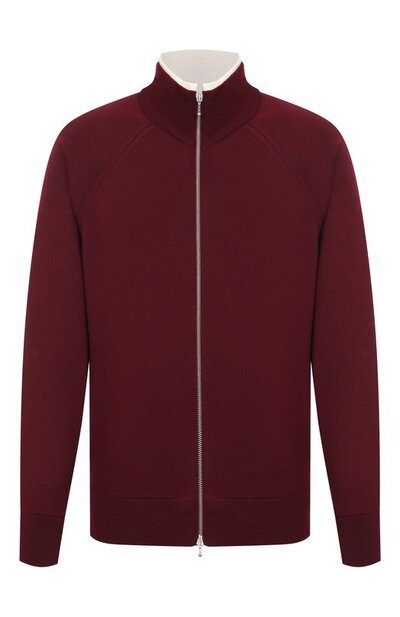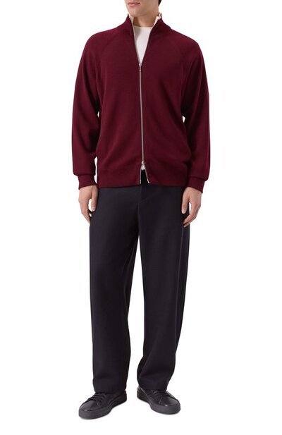 Для создания кардигана на встречной молнии использовали гладкий меланжевый трикотаж из чистой шерсти. Высокую горловину подчеркнули контрастным кантом, создающим эффект многослойности.