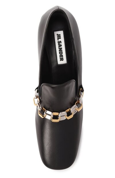 Туфли на скульптурном каблуке средней высоты изготовили из козьей кожи. Союзку модели с круглым мысом украсили двухцветной цепочкой с плоскими звеньями.