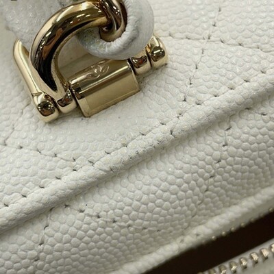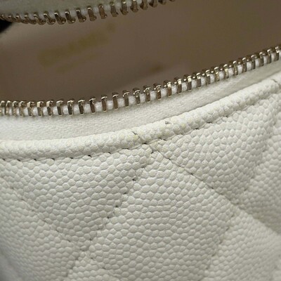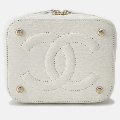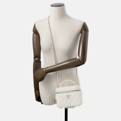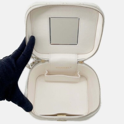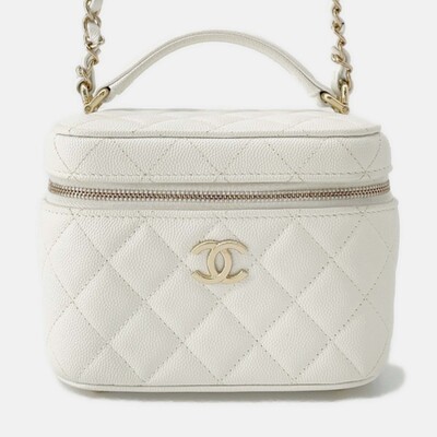 This authentic Chanel Chain Shoulder Bag Matelassé Coco Mark Vanity Case in Small White is a quintessential designer accessory, featuring the brand’s signature quilted matelassé design and iconic Coco Mark. A pre owned, pre loved piece, it offers timeless elegance in a compact, structured silhouette. Perfect for collectors and fashion enthusiasts alike, this Chanel Vanity Case embodies sophistication and enduring luxury.