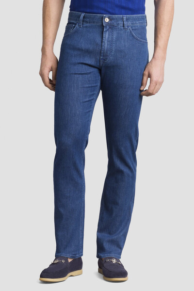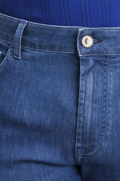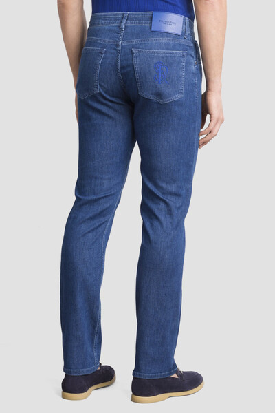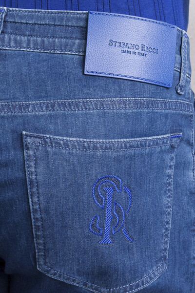 Синие джинсы Stefano Ricci сочетают в себе роскошь, безупречное качество и функциональность. Мягкий деним из смеси хлопка, гипоаллергенного лиоцелла и гладкого шёлка с добавлением небольшого количества стрейчевых волокон обеспечивает невероятный комфорт. Модель интересна дизайнерскими потёртостями и наличием знаковой для бренда символики: кожаного патча с тиснёным логотипом на поясе сзади и крупной вышитой монограммой с эффектом плетения, размещённой на правом заднем кармане. Являясь вневременной классикой, изделие идеально впишется в повседневный мужской гардероб.