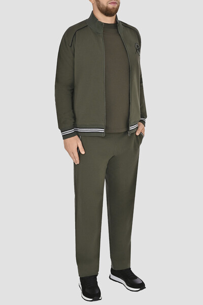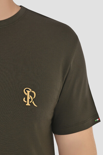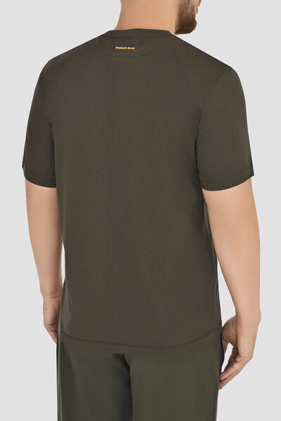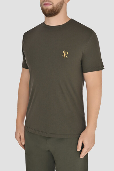 Прямая футболка Stefano Ricci станет основой спортивных и повседневных комплектов. Для пошива изделия с круглым вырезом горловины на резинке выбран мягкий трикотаж на основе хлопка и модала в оттенке хаки. Отличительными деталями являются золотистые крупный лого-монограмма слева на груди и надпись-логотип на кокетке.