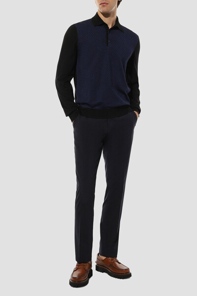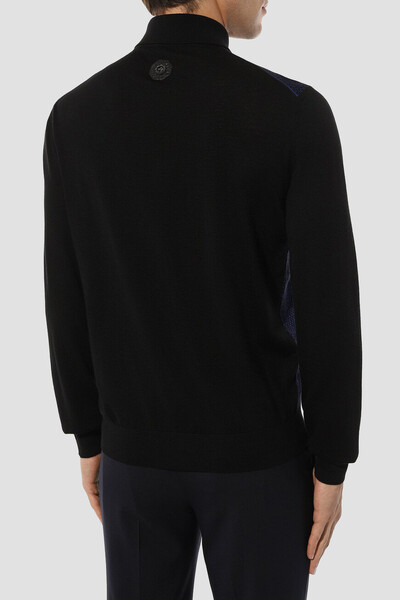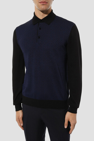 Угольно-чёрное поло Stefano Ricci сможет заменить рубашку для офиса с нестрогим дресс-кодом. Изделие связано из тонкой шерстяной пряжи премиального качества лицевой гладью. Волокна гладкого шёлка в составе материала не дают модели пилинговаться и придают ей деликатный блеск. На вставке спереди размещён замысловатый геометрический узор сапфирового цвета, выполненный в технике жаккард. На принадлежность поло прямого силуэта Дому указывает брендированный патч-восьмигранник из фактурной кожи миссисипского аллигатора, расположенный на спинке.