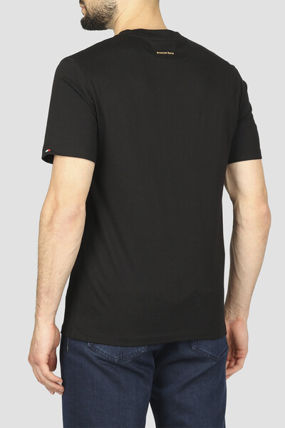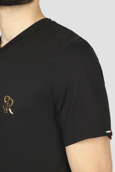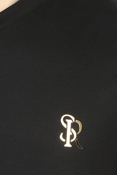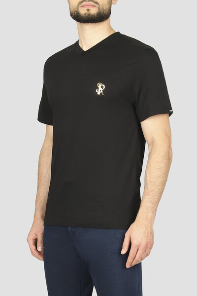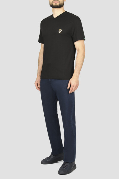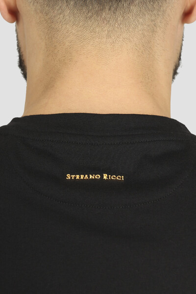 Базовая футболка Stefano Ricci с золотистой знаковой символикой. Фасон изделия, для производства которого используется комбинация из хлопка и модала, характеризуется прямым кроем и наличием изящного V-образного выреза горловины на резинке. Слева на груди размещена лого-монограмма SR, а кокетка декорирована рельефной надписью-логотипом, выполненной из металла.
