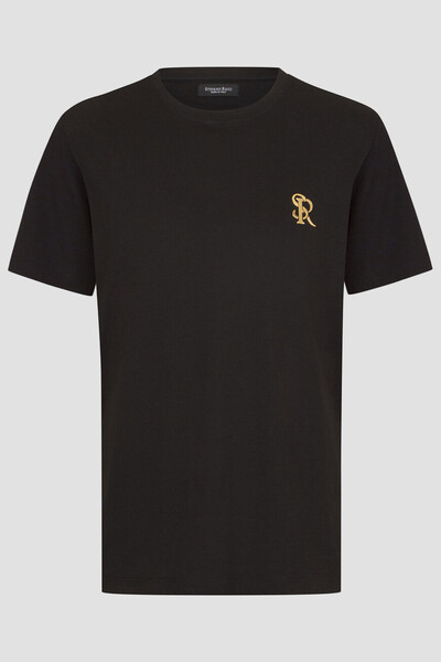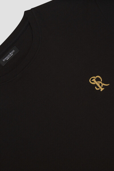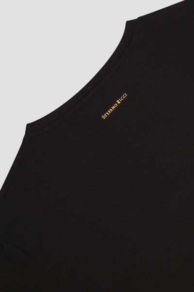 Почти невесомая футболка Stefano Ricci чёрного базового цвета. Изделие выполнено из тонкого трикотажа на основе хлопка и модала, который не препятствует циркуляции воздуха. Характерными особенностями модели прямого силуэта стали наличие круглого выреза горловины на резинке и золотистого знакового декора: крупного лого-монограммы Дома слева на груди и надписи-логотипа, расположенного на кокетке.