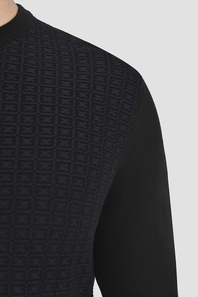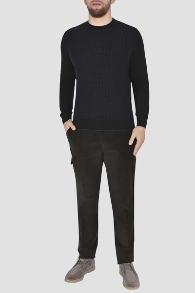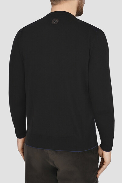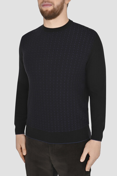 Трикотажный свитер прямого силуэта от Stefano Ricci. Модель изготовлена на основе мягкой шерсти и гладкого шёлка тёмно-коричневого оттенка и дополнена вставкой с геометрическим узором спереди. Отличительными деталями являются патч-восьмигранник из экзотической кожи аллигатора, размещённый на спинке, и синяя полоса-кант в нижней части манжет рукавов и эластичного пояса.