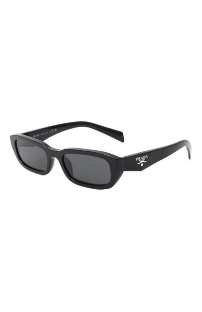 Прямоугольные солнцезащитные очки с дымчатыми линзами, не пропускающими ультрафиолет, изготовили из ацетата. Принадлежность аксессуара марке подчеркнули треугольниками с контрастными логотипами на дужках.