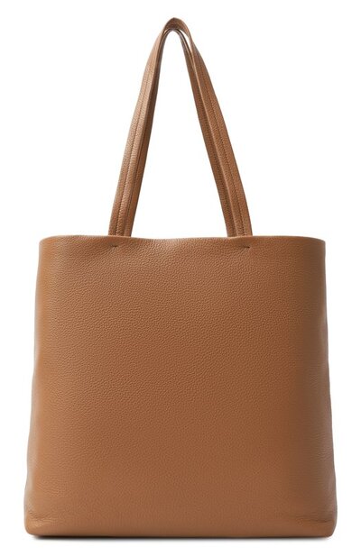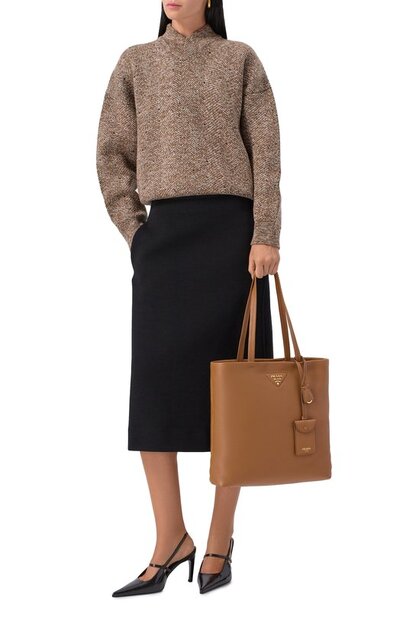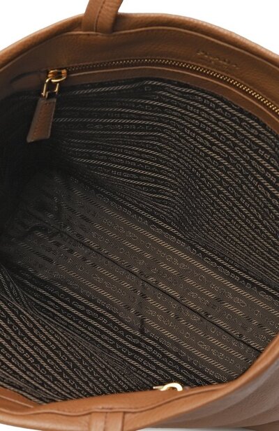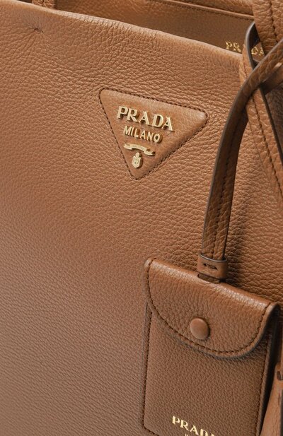Сумку-тоут из зернистой телячьей кожи украсили фирменным треугольником с металлическим логотипом марки. На одной из ручек закрепили брелок с кольцом для ключей и карточным слотом. Внутри предусмотрели два кармана на молниях.
