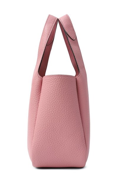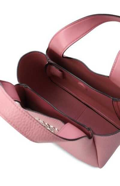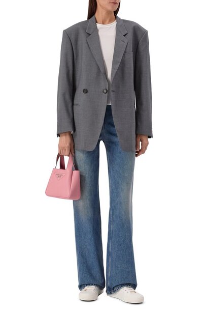 Сумку из зернистой телячьей кожи украсили фирменным треугольником с металлическим логотипом. Внутри аксессуара с двумя короткими ручками предусмотрели три отделения, дополнив центральное магнитной застежкой.