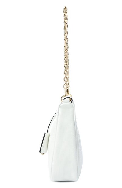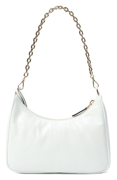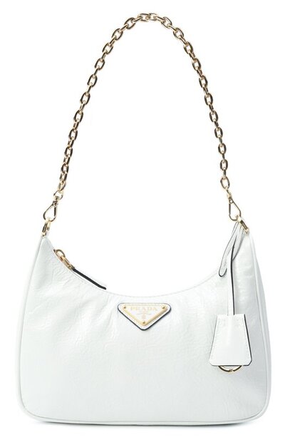 Сумку Re-Edition со съемными плечевым ремнем и ручкой-цепочкой выполнили из лакированной кожи. Аксессуар с фирменным эмалевым треугольником спереди дополнили брелоком.
