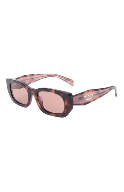 Солнцезащитные очки прямоугольной формы изготовили из ацетата черепаховой расцветки. Аксессуар с линзами, не пропускающими ультрафиолет, украсили выгравированным логотипом на фигурных дужках.