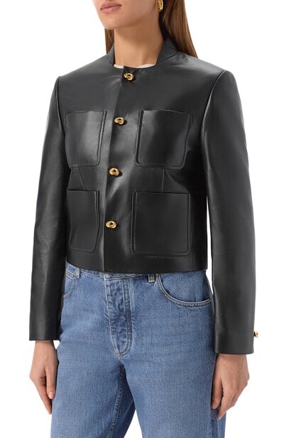Укороченный жакет из кожи ягненка дополнили четырьмя накладными карманами. Модель застегивается металлическими фирменными пуговицами Knot.