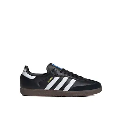 Мужские кроссовки (кеды) Samba OG от немецкого бренда adidas Originals. Одна из старейших моделей бренда, выпущенных в в 1949 году для игры в футбол на обледенелых полях. В то время кроссовки производились из кожи кенугуру и оснащались цепкой резиновой подошвой. Конечно, современный силуэт значительно отличается от своего изначального варианта. Данная пара выполнена из сочетания натуральной кожи и синтетических материалов. Оснащена классической системой шнуровки, легендарным Т-образным мыском и тонкой подошвой. Пара представлена в универсальной черной расцветке, дополнена логотипом бренда на язычке, золотистой гравировкой с названием модели и фирменными Three Stripes на боковой панели.