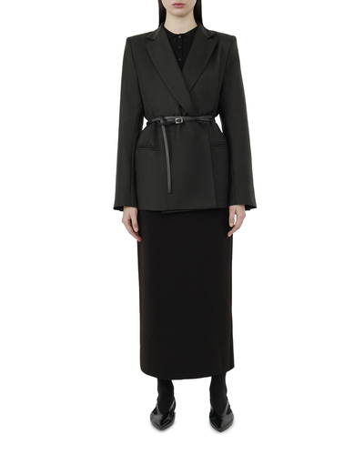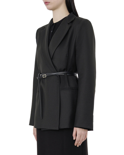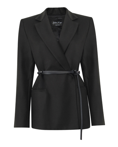 Этот жакет — образец современного кроя и утонченной элегантности. Силуэт подчеркнут приталенной конструкцией, которая создает безупречный силуэт и подчёркивает женственность. Лацканы классического типа добавляют уверенности и сдержанности образу, оставаясь в духе элегантной классики. Детали отделки включают в себя изящный пояс из гладкой кожи, который акцентирует внимание на талии и привносит стильный, модный элемент, сохраняя общий силуэт обогащённым и структурированным. Карманы с клапанами искусно интегрированы в фасон, предлагая практичность без ущерба для эстетики. Этот жакет станет прекрасным дополнением как к деловому гардеробу, так и к вечернему образу, сочетаясь с юбками и брюками, и привнося нотку изысканности и уверенности в ваш стиль.