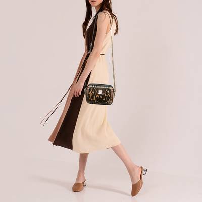 Burberry’s TB camera bag exudes contemporary edge with a mix of leopard print calf hair and heritage House Check panels. The gleaming Thomas Burberry monogram clasp punctuates its bold texture play. Perfect for evenings or casual city days, it pairs British craftsmanship with modern glamour.