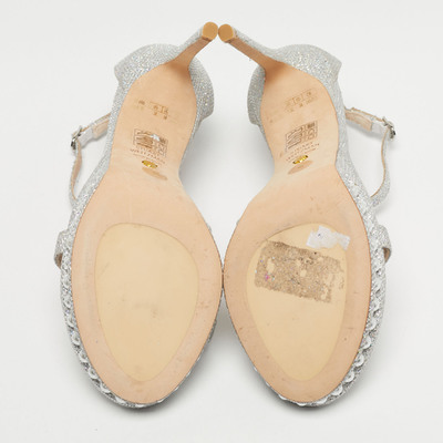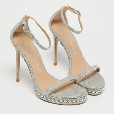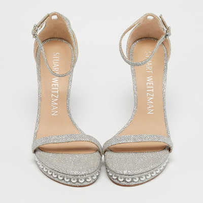 Sparkling and glamorous, these Stuart Weitzman Nudist sandals are crafted with silver glitter for head turning shine. The ankle strap provides support while elongating the leg. Perfect for special occasions or festive events.