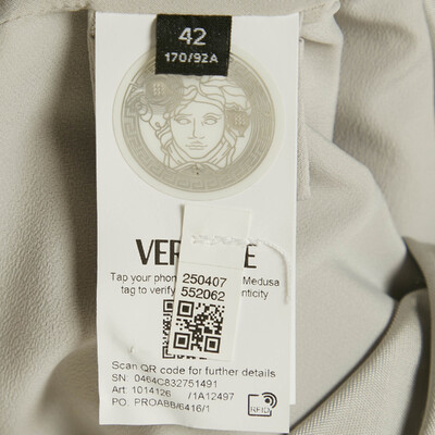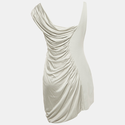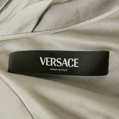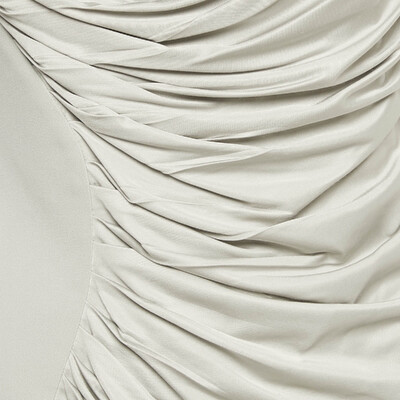In shades of cool grey, this Versace mini dress plays with light and movement. The contrast of matte crepe and liquid satin creates sculptural draping that flatters and flows. Every fold feels deliberate, designed for evenings that demand presence and precision.