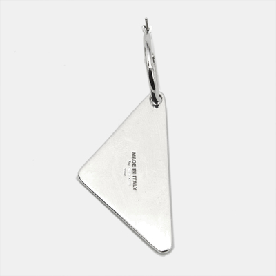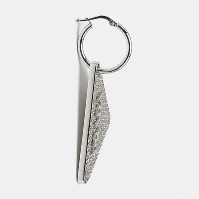 Prada’s single earring redefines minimalism with a sculptural silver silhouette accentuated by crystal detailing. Showcasing the brand’s iconic triangle logo, it merges industrial coolness with understated luxury. Wear it solo for a directional, high fashion statement.