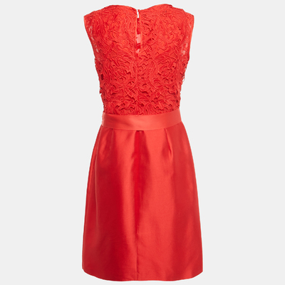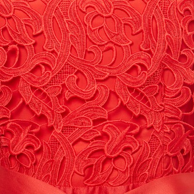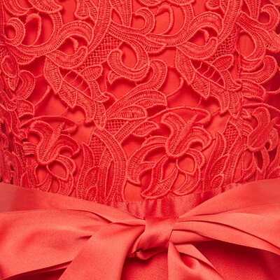 Vivid in red, this CH Carolina Herrera dress combines floral lace with smooth crepe for a striking contrast. The sleeveless silhouette and the bow tie detailing on the waist brings effortless elegance with a touch of romance. A perfect pick for cocktail parties or celebratory events.