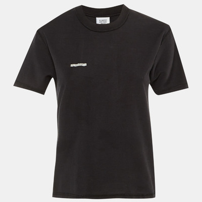 Vetements reinvents everyday dressing with this black crew neck T shirt, rendered inside out to reveal raw seams and familiar detailing. The relaxed cotton silhouette carries an effortless energy while the back print adds an instant Vetements sign off.